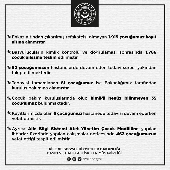 Aile ve Sosyal Hizmetler Bakanlığı'nın verilerine göre, enkaz altından çıkarılan ve refakatçisi olmayan 1915 çocuk kayıt altına alındı.